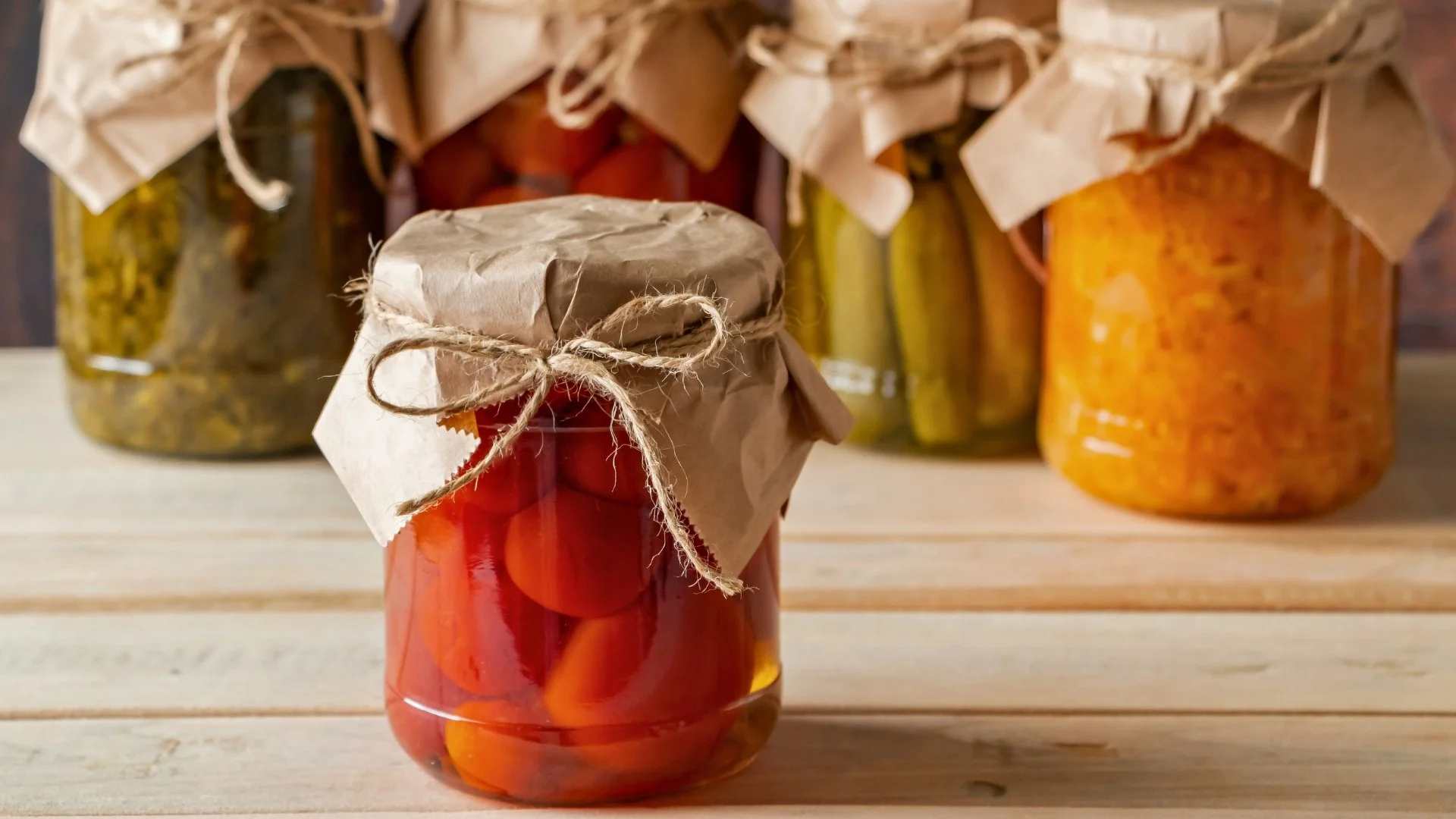 Jars of brightly-coloured jellies and pickles on a light wood surface, each jar capped with butcher paper and tied with twine.